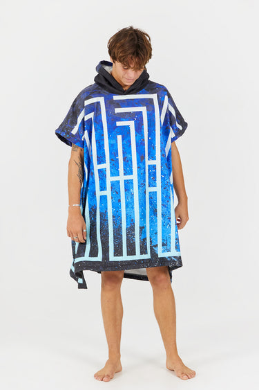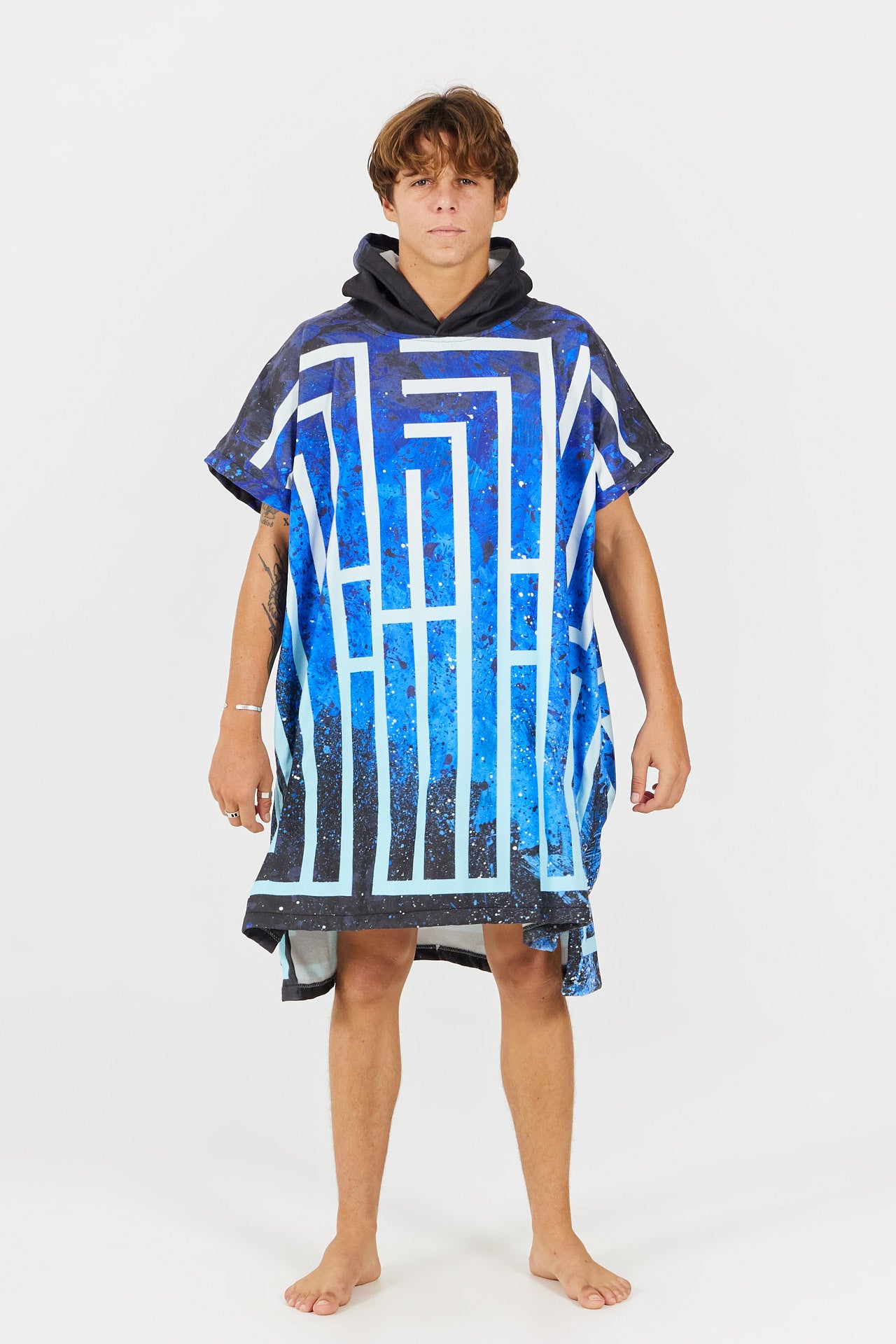Confectionné avec un extérieur en 100 % polyester, le poncho est léger et met en valeur les contrastes graphiques de l’œuvre. Sa coupe oversize et ses côtés ouverts permettent un enfilage facile, tandis que la doublure en éponge 100 % coton et la capuche généreuse offrent chaleur et confort après une session de surf, une baignade ou toute activité aquatique.