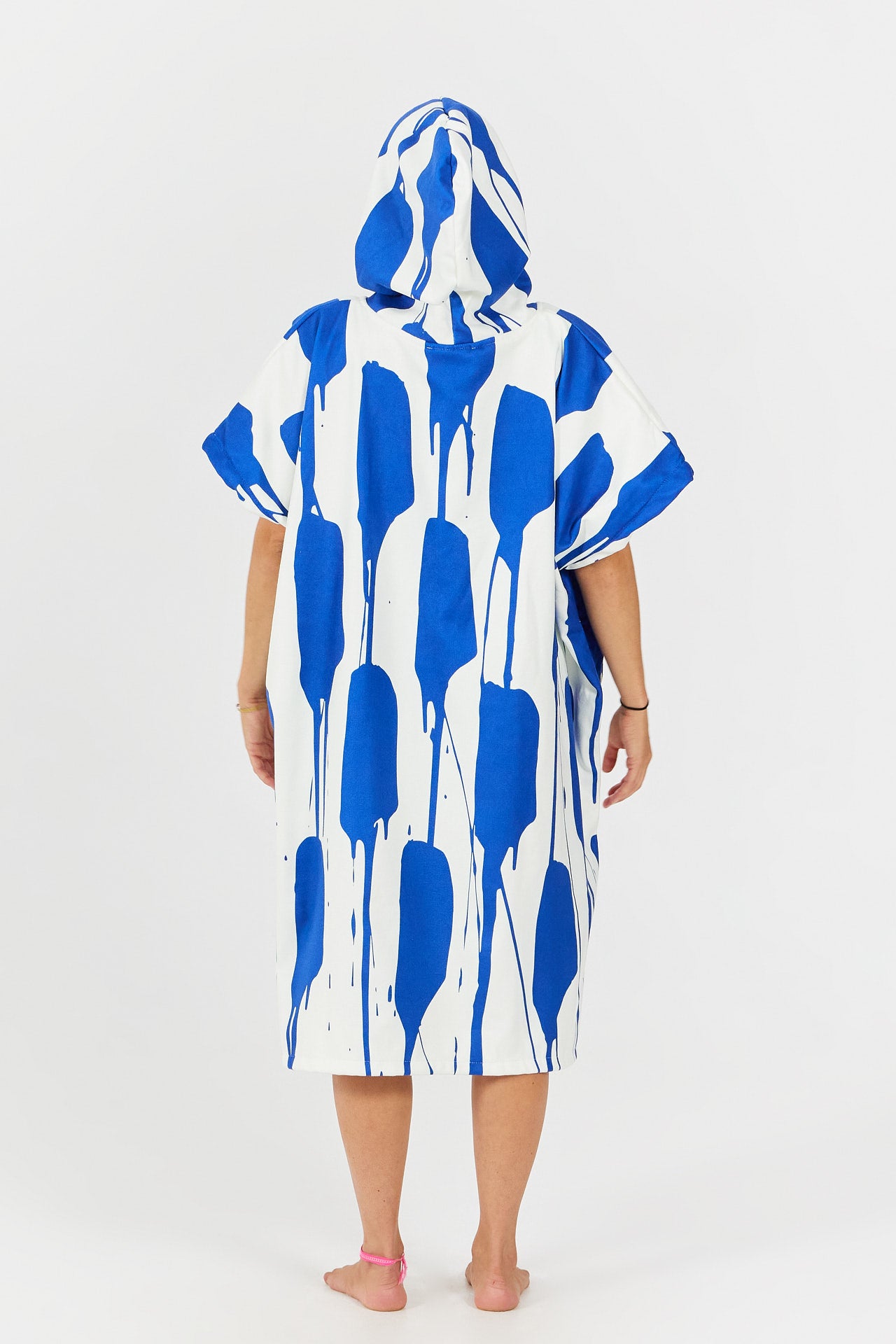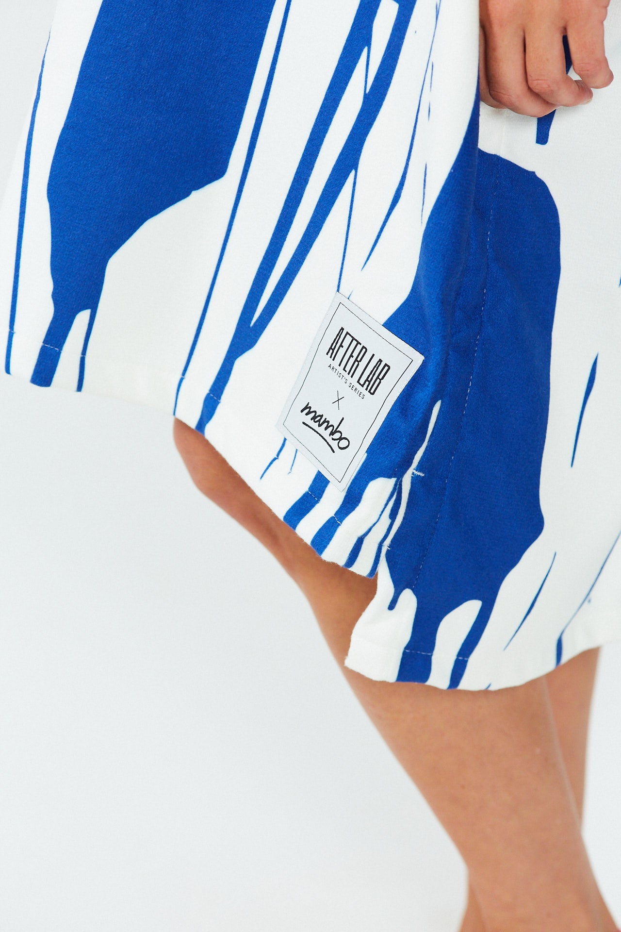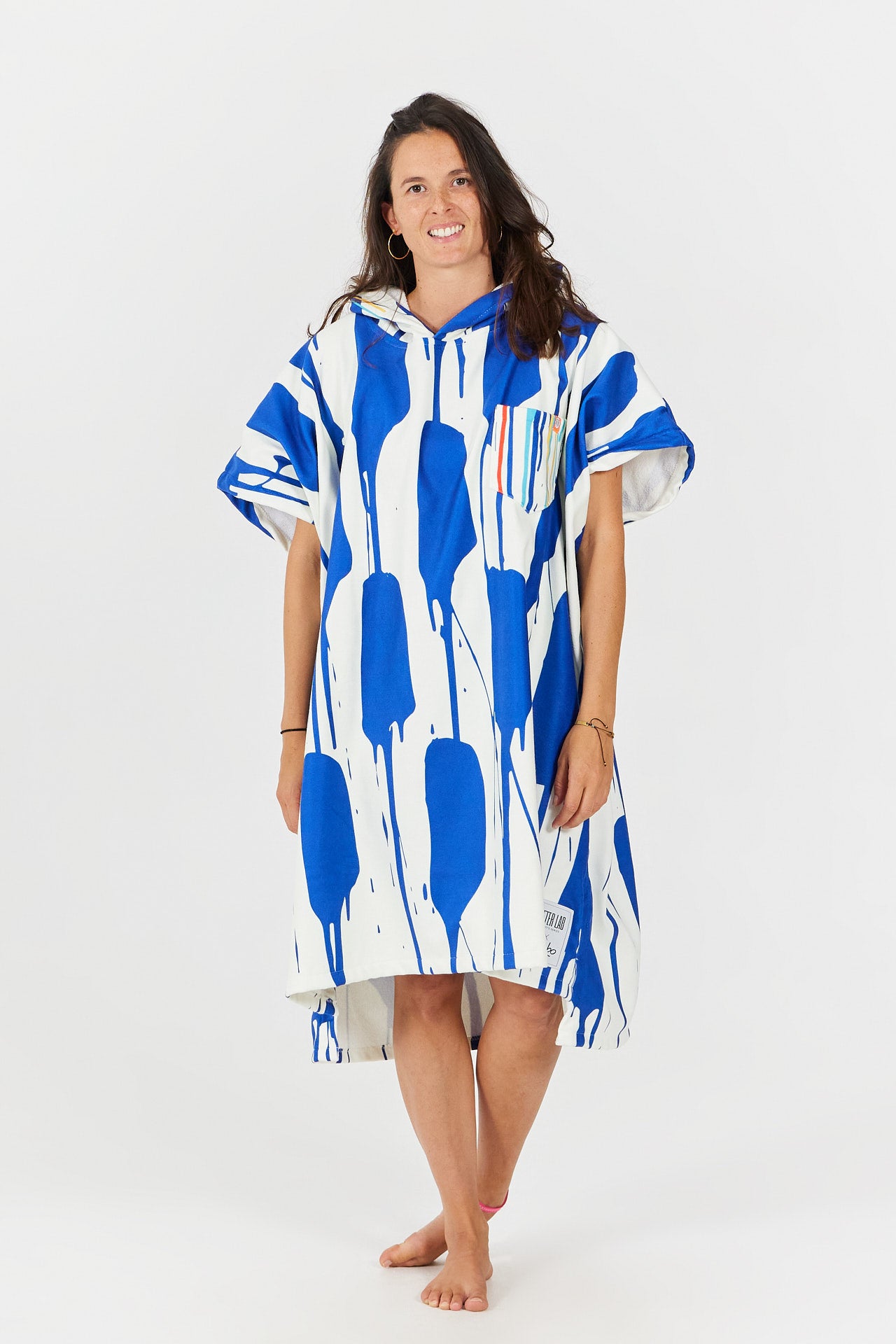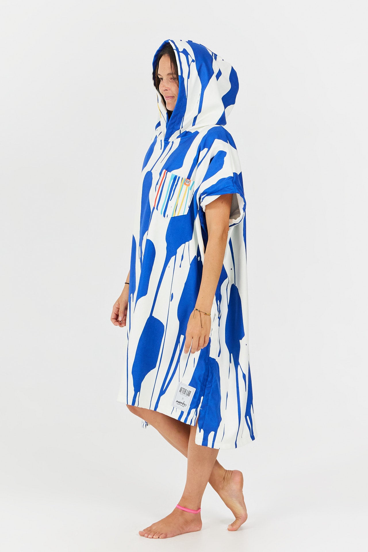 Sur ce poncho en collaboration,  Mambo  donne vie à sa signature artistique à travers un motif bleu en all-over, imprégné d’une énergie audacieuse, ludique et abstraite. Le design offre une vibe urbaine mêlée à l’esprit plage, transformant un simple poncho de plage en véritable produit artistique.