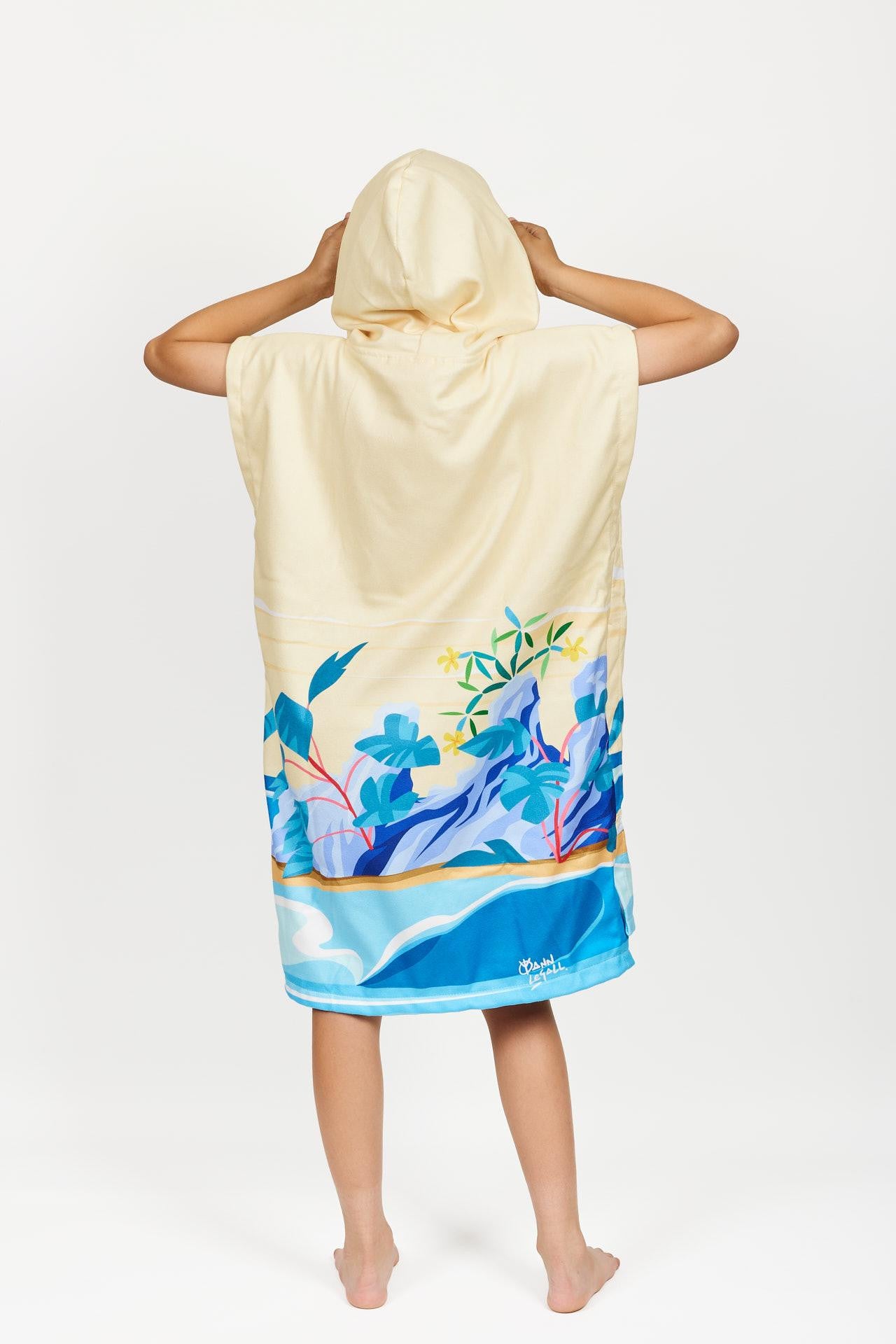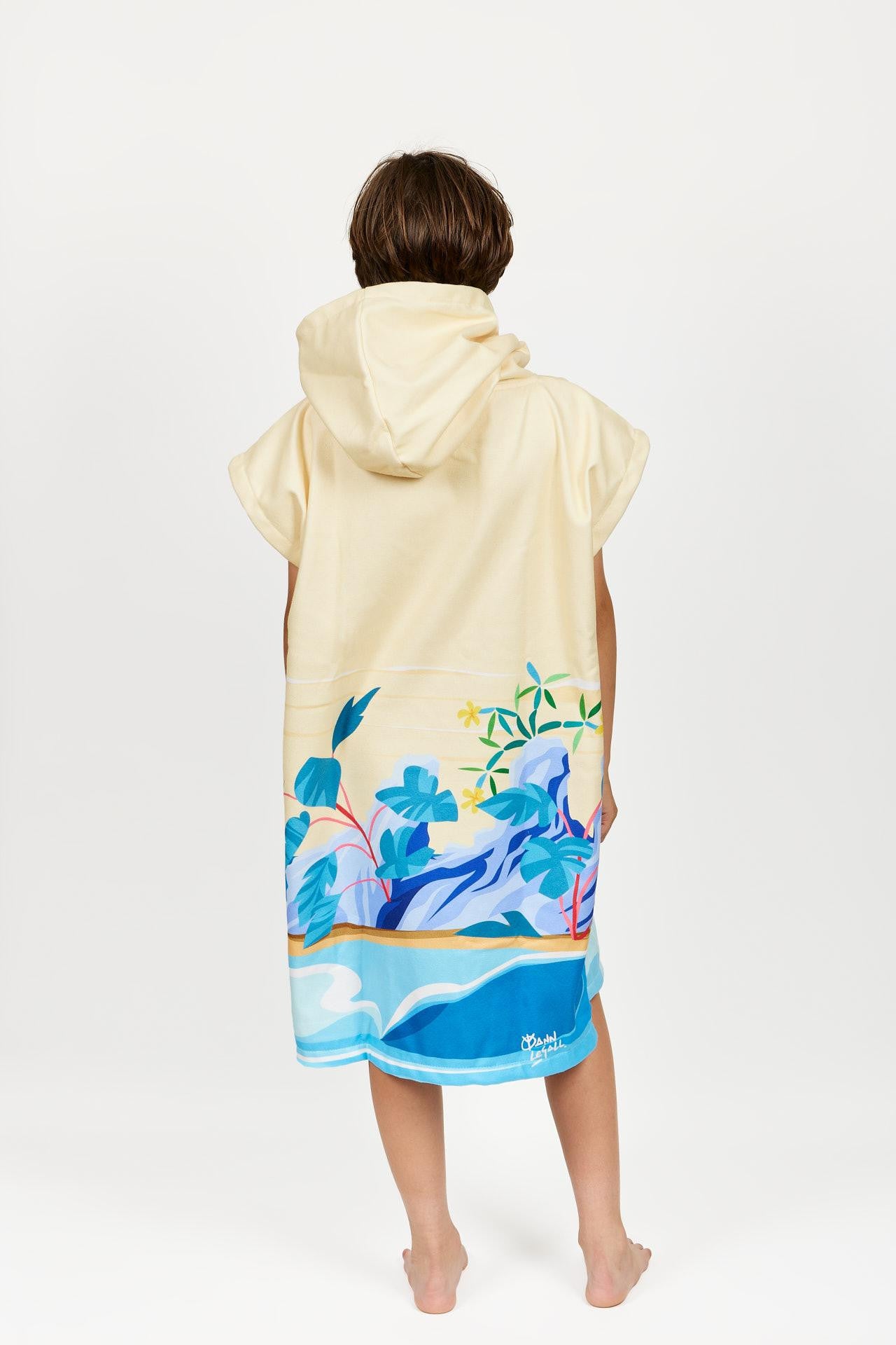 Ce poncho enfant est une collaboration avec Yann Le Gall, graffeur réunionnais passionné de bodyboard. Inspiré par les paysages tropicaux et la culture de La Réunion, son design coloré mêle vagues, plages et motifs locaux.
